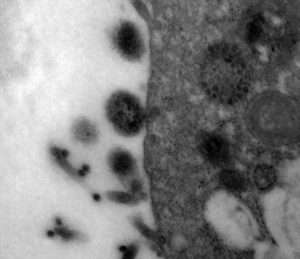 Na trećoj fotografiji možemo vidjeti čestice virusa koje su prodrle u stanicu. Npr., možemo ih uočiti u lijevom donjem uglu kao nakupinu crnih tačkica u bjeličastom krugu.