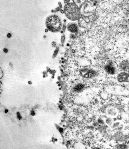 Zadnja fotografija prikazuje kako čestice virusa SARS-CoV-2 napuštaju unutrašnjost stanice i kreću prema drugoj zdravoj stanici, nastavljajući s ciklusom infekcije. Tamne čestice virusa mogu se jasno vidjeti izvan stanice u donjem lijevom uglu.